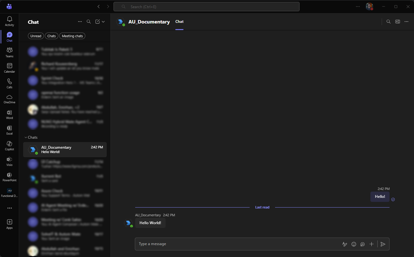 51. Type **"Hello"** into the message field and execute the Autom. Your Teams bot will now respond with **"Hello World!". You can find the example Autom at below; you can download it and then configure credentials. After that you can use this, Autom. Do not forget the set trigger type as webhook.**