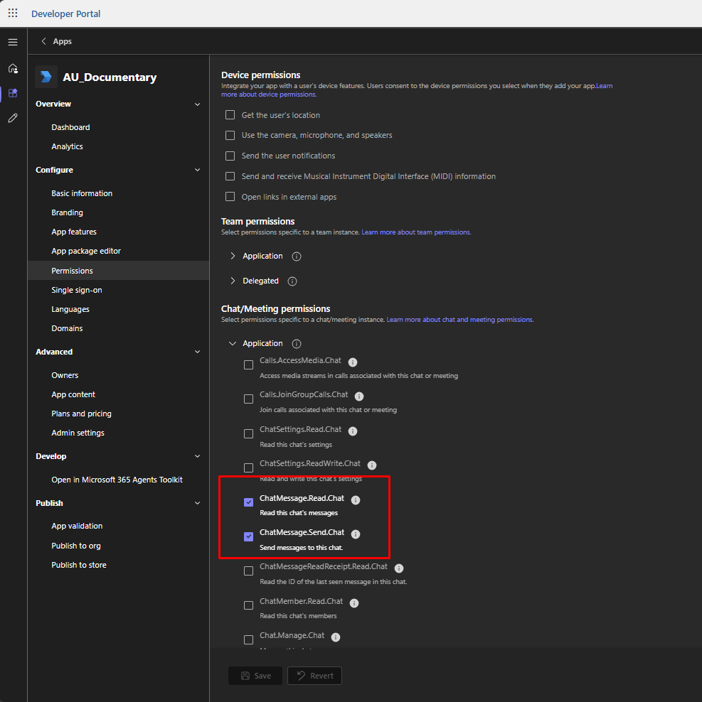 31. Expand **Teams Permissions → Application**.