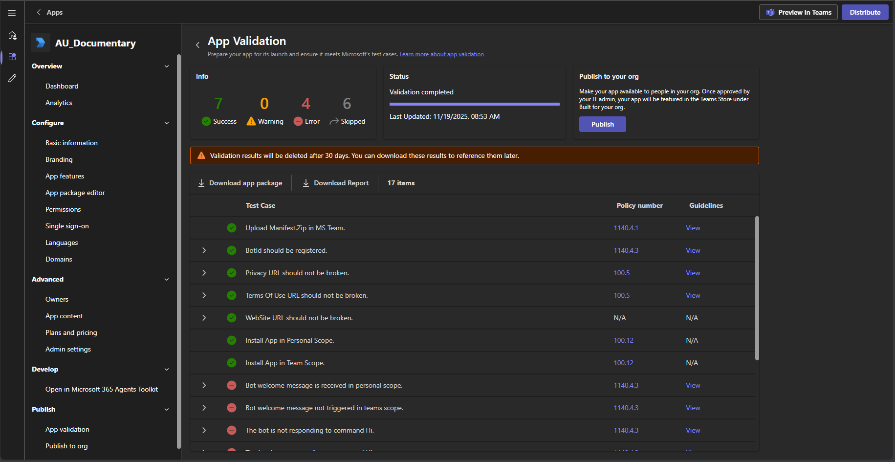 41. Open the **App Validation** section in the Developer Portal.