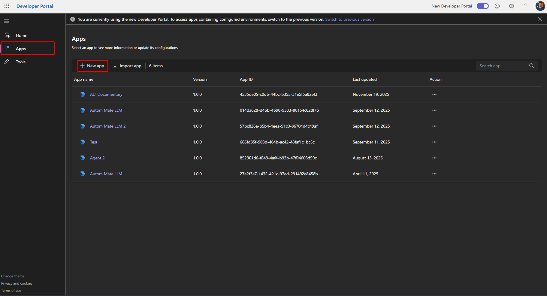 27. Click **Create a New App** to create a Teams app container.