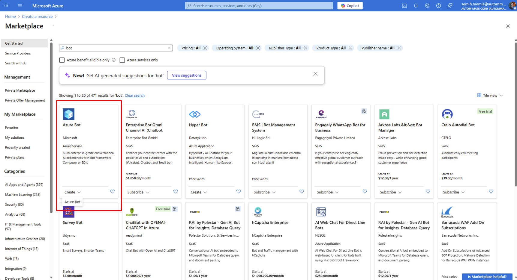 6. Search for **Azure Bot Service**, select it, and click **Create**.