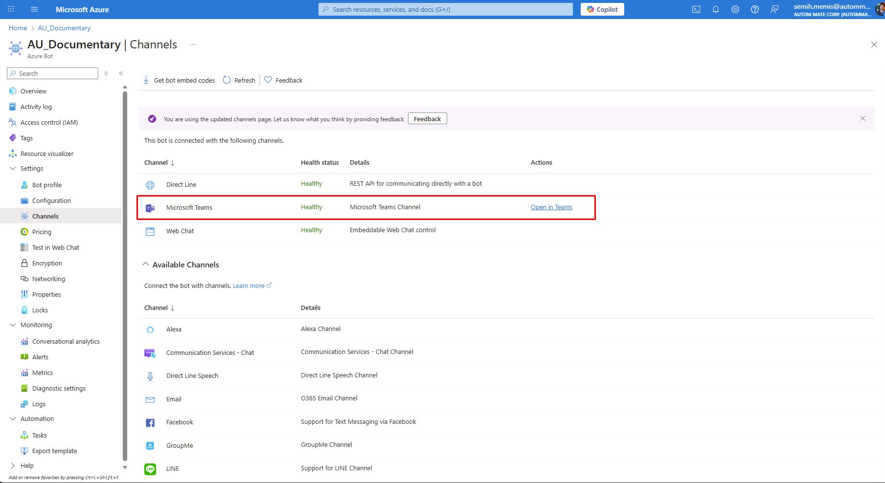 14. Under *Available Channels*, find **Microsoft Teams** and open it.