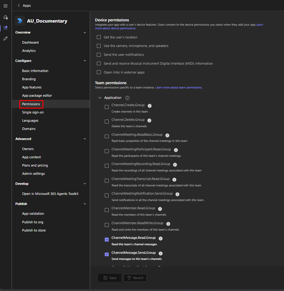 1. **Teams / Application Permissions:**