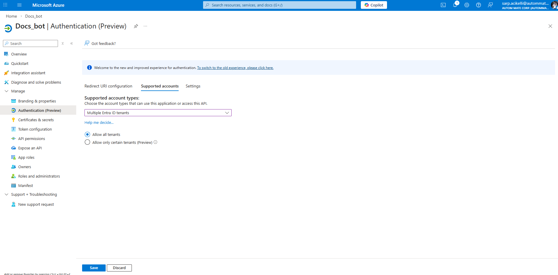 25. Change the supported account type **Multiple Entra ID tenants** and choose **Allow all tenants.** Save the page.