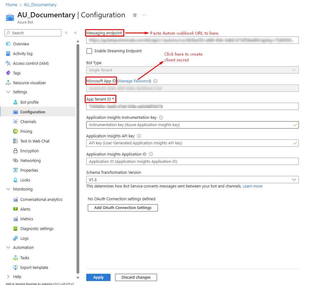 17. In the **Messaging Endpoint** field, paste the webhook URL you created in Autom Mate. And then click to "Apply" button. Please be careful to apply, sometimes you need to click double to make sure it saved.